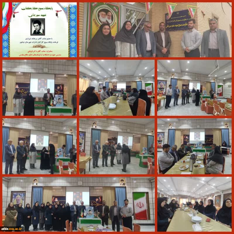 سپس خواهر شهید گرانقدر سعید سیرجانی، از همکاران پیشکسوت آموزشکده ضمن بازگویی خاطراتی از برادر شهید خود، بر ارزش والای ایثار و فداکاری در مسیر پاسداری از انقلاب اسلامی تأکید کرد و یاد و نام شهدای هشت سال دفاع مقدس و جنگ ۱۲ روزه را گرامی داشت.